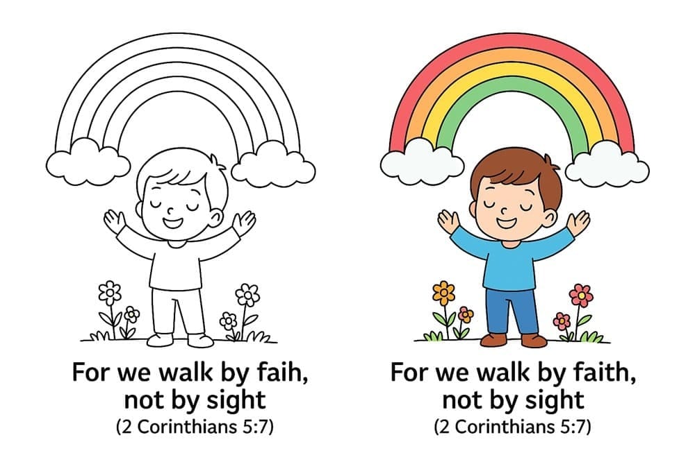 “Create a black-and-white line art illustration of a cheerful child standing under a rainbow with hands raised in prayer. Include the verse: ‘For we walk by faith, not by sight’ (2 Corinthians 5:7). Keep the style simple, peaceful, and easy for children to color.”